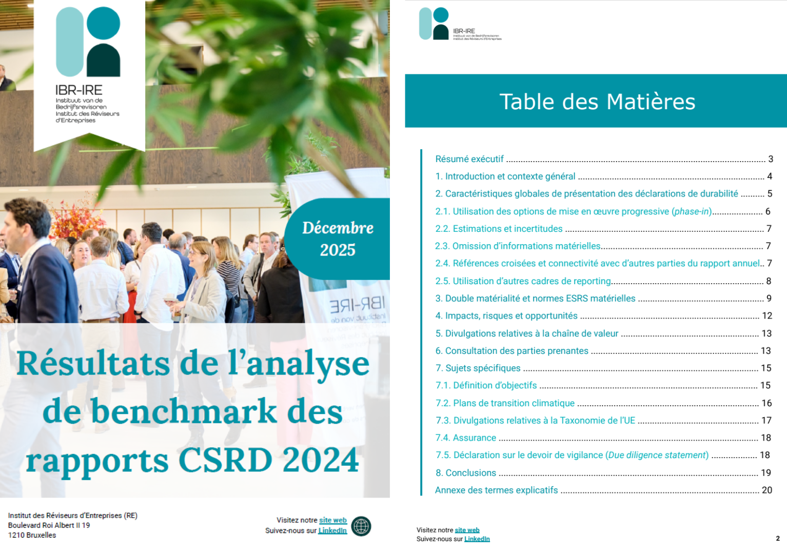 Publiée fin décembre 2025, cette brochure présente un benchmark portant sur 23 déclarations de durabilité belges publiées en 2024, dont 14 entreprises composantes du BEL20 et 2 du secteur des services financiers. Elle offre ainsi une représentation du paysage belge coté et financier (Entités d’Intérêt Public ou EIP).